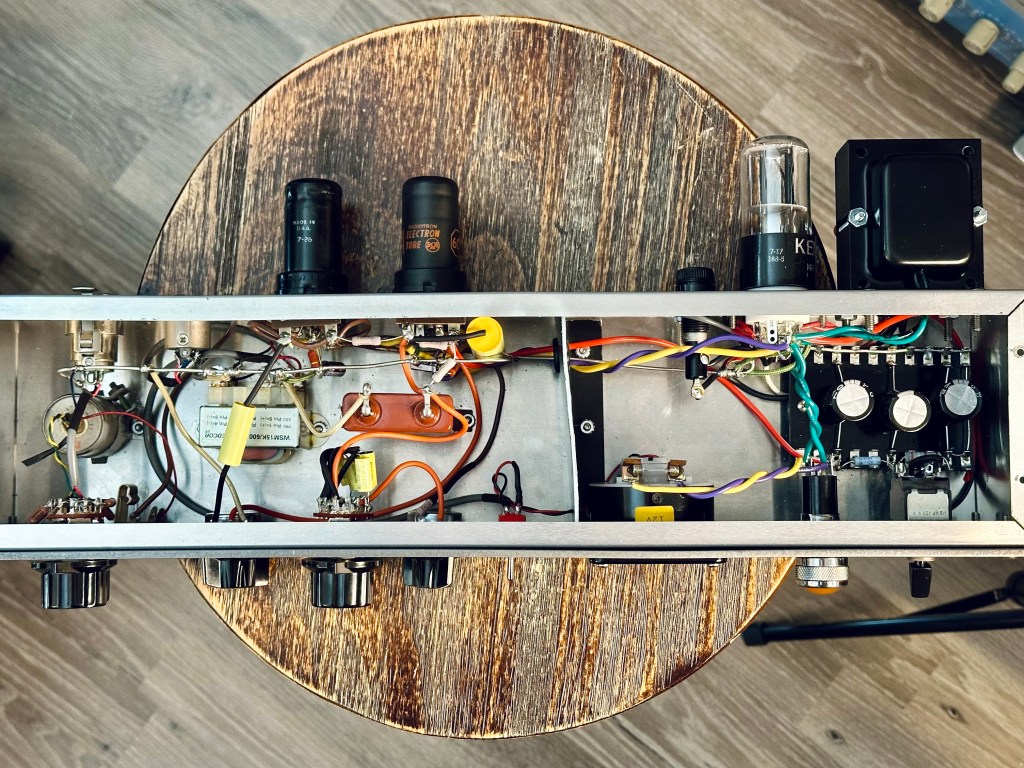 Now we’ve got a fully assembled chassis and have applied a few coats of paint to our faceplate. Next, I’ll start soldering and wiring components, doing as much as I can without needing the front panel parts. Once the panel is dry, I mount it and finish all the wiring. Eventually, it looks like the picture below.